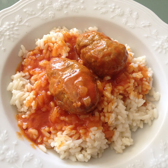 In a saucepan saute onion and garlic in olive oil, then add wine, tomato juice, 1 cup water, spices, salt and pepper (the amount you wish). When sauce thickens, then add the meatballs and cook for about 10΄.